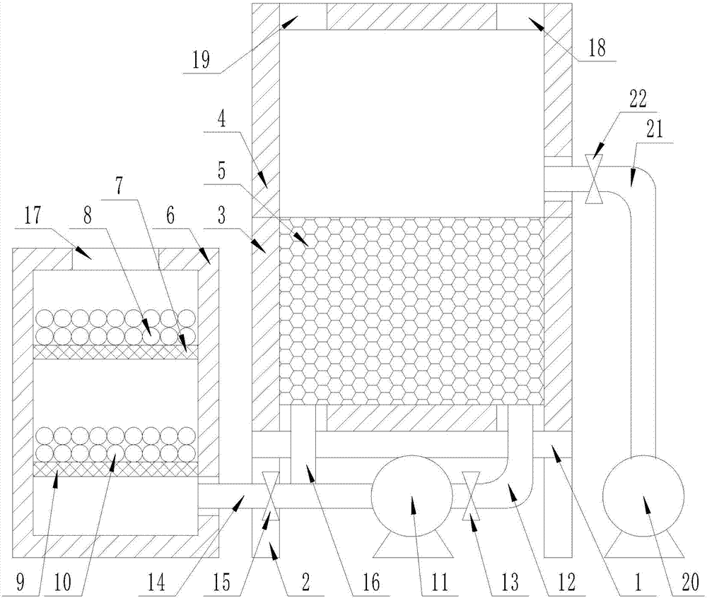 在本實施方案中,在設(shè)備空閑處設(shè)有HB104控制器,控制器的輸出端與一號電磁閥13、二號電磁閥15、三號電磁閥22、一號引風(fēng)機(jī)11、二號引風(fēng)機(jī)20的輸入端均通過導(dǎo)線相連接,將設(shè)備連接電源,通過控制控制器控制二號電磁閥15、一號引風(fēng)機(jī)11打開,一號電磁閥13、三號電磁閥22、二號引風(fēng)機(jī)20關(guān)閉,從廢氣廢氣進(jìn)氣口17進(jìn)入矩形箱體6,經(jīng)過一號網(wǎng)格擋板7上的脫氮劑8祛除廢氣中的氮,經(jīng)過二號網(wǎng)格擋板9上的脫硫劑10祛除廢氣中的硫;脫硫劑10、脫氮劑8能夠與化肥廠合作提取合成化肥,利用率提高;在一號引風(fēng)機(jī)11的作用下通過二號管道14、三號管道16進(jìn)入U形槽3,經(jīng)過陶瓷蓄熱體5進(jìn)入到倒U形槽4,倒U形槽4內(nèi)通過燃料入口18加入燃料,通過進(jìn)風(fēng)口19加入氧氣,將廢氣加熱到700-900攝氏度使廢氣中的VOC在氧化分解成二氧化碳和水,氧化產(chǎn)生的高溫氣體流經(jīng)特制的陶瓷蓄熱體5,使陶瓷蓄熱體5升溫而“蓄熱”,此“蓄熱”用于預(yù)熱后續(xù)進(jìn)入的有機(jī)廢氣,從而節(jié)省廢氣升溫的燃料消耗,可以控制三號電磁閥22、二號引風(fēng)機(jī)20的開關(guān)控制廢氣處理時間,達(dá)到時間后打開三號電磁閥22、二號引風(fēng)機(jī)20,在二號引風(fēng)機(jī)20的作用下將處理后的廢氣排出;也可以控制一號電磁閥13、一號引風(fēng)機(jī)11打開,二號電磁閥15、三號電磁閥22關(guān)閉,將廢氣循環(huán)引入U形槽3、倒U形槽4內(nèi),可循環(huán)處理,多次處理后廢氣分解效率達(dá)到99%以上,節(jié)約空間、節(jié)省投資費用。